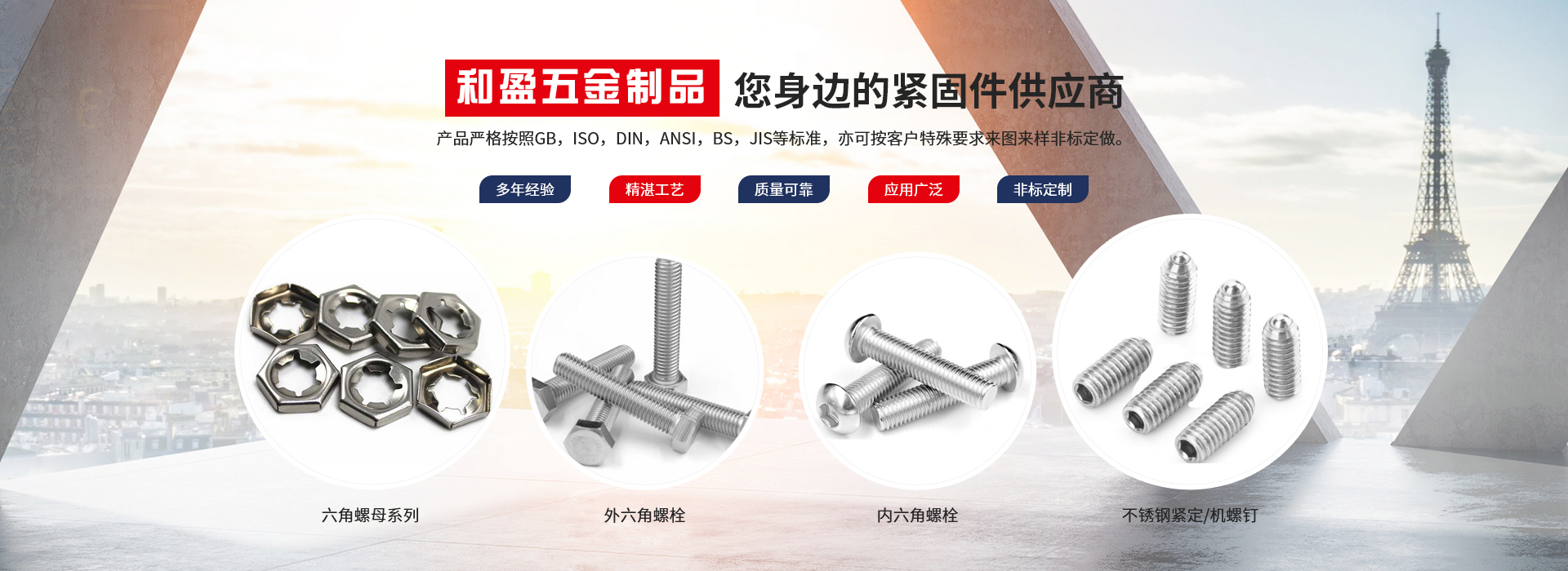 興化市和盈五金制品有限公司創(chuàng)建于2010年,坐落在全國不銹鋼名鎮(zhèn)———江蘇戴南。本公司集當?shù)夭讳P鋼優(yōu)勢和全國銷售網(wǎng)點,以不銹鋼緊固件產(chǎn)品為主體的企業(yè)。我們將始終如一的堅持以客戶為中心,堅持以品質(zhì)取勝的發(fā)展戰(zhàn)略,依靠科學技術不斷創(chuàng)新。秉承這種精神,我們一起和諧合作,共贏未來。產(chǎn)品嚴格按照GB,ISO,DIN,ANSI,BS,JIS等標準,亦可按客戶特殊要求來圖來樣非標定做。產(chǎn)品廣泛應用......